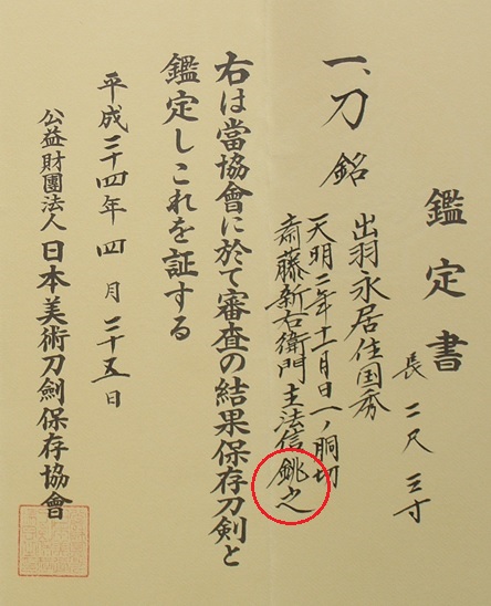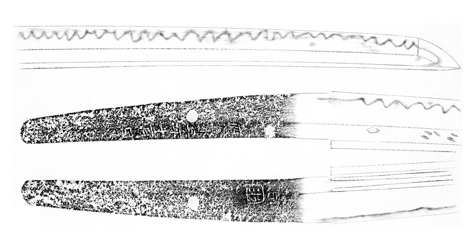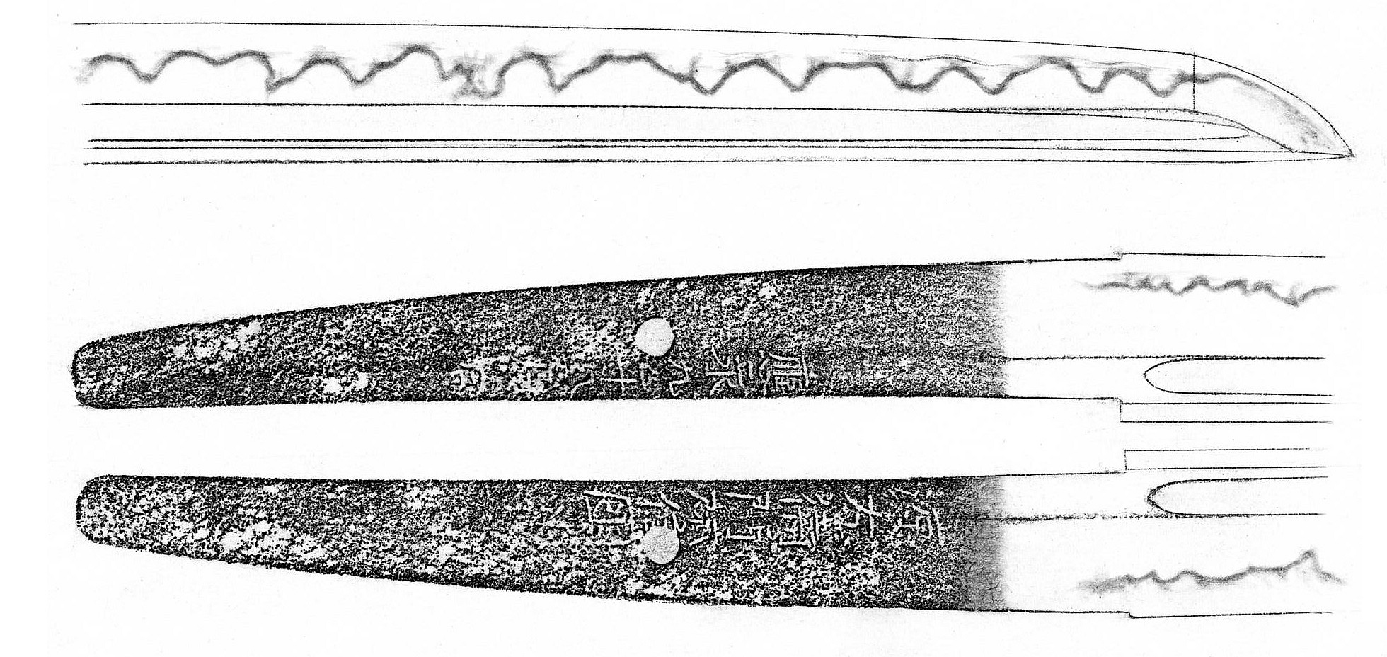 Picture 16: tachi, mei: “Minamoto Saemon no Jô Nobukuni” (源左衛門尉信国) – “Ôei kunen hachigatsu hi” (応永九年八月日, “a day in the eighth month of Ôei nine [1402]”), nagasa 80.3 cm, sori 1.8 cm, mihaba 2.8 cm, sakihaba 1.95 cm, shinogi-zukuri, iori-mune