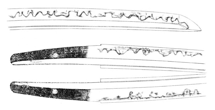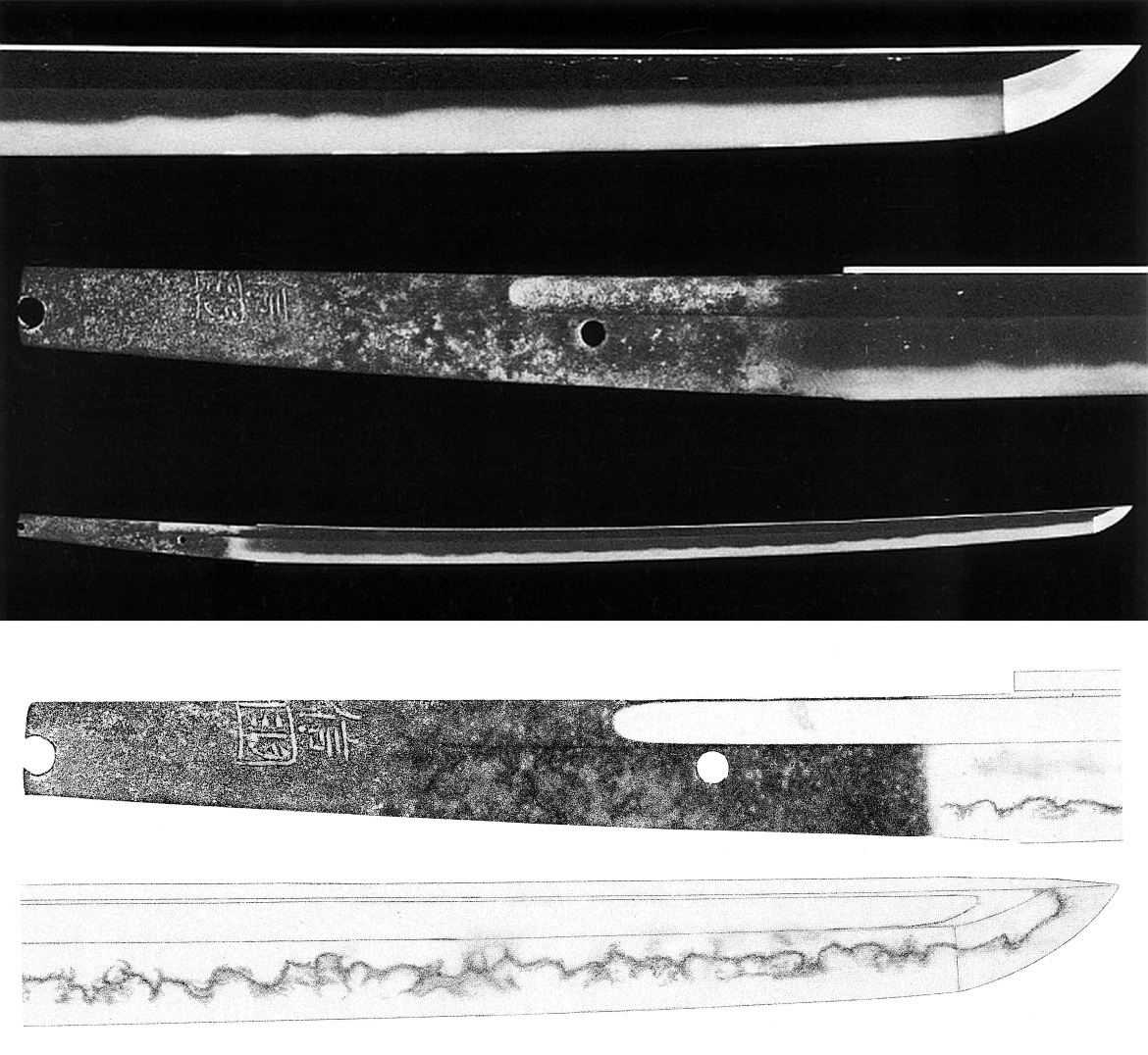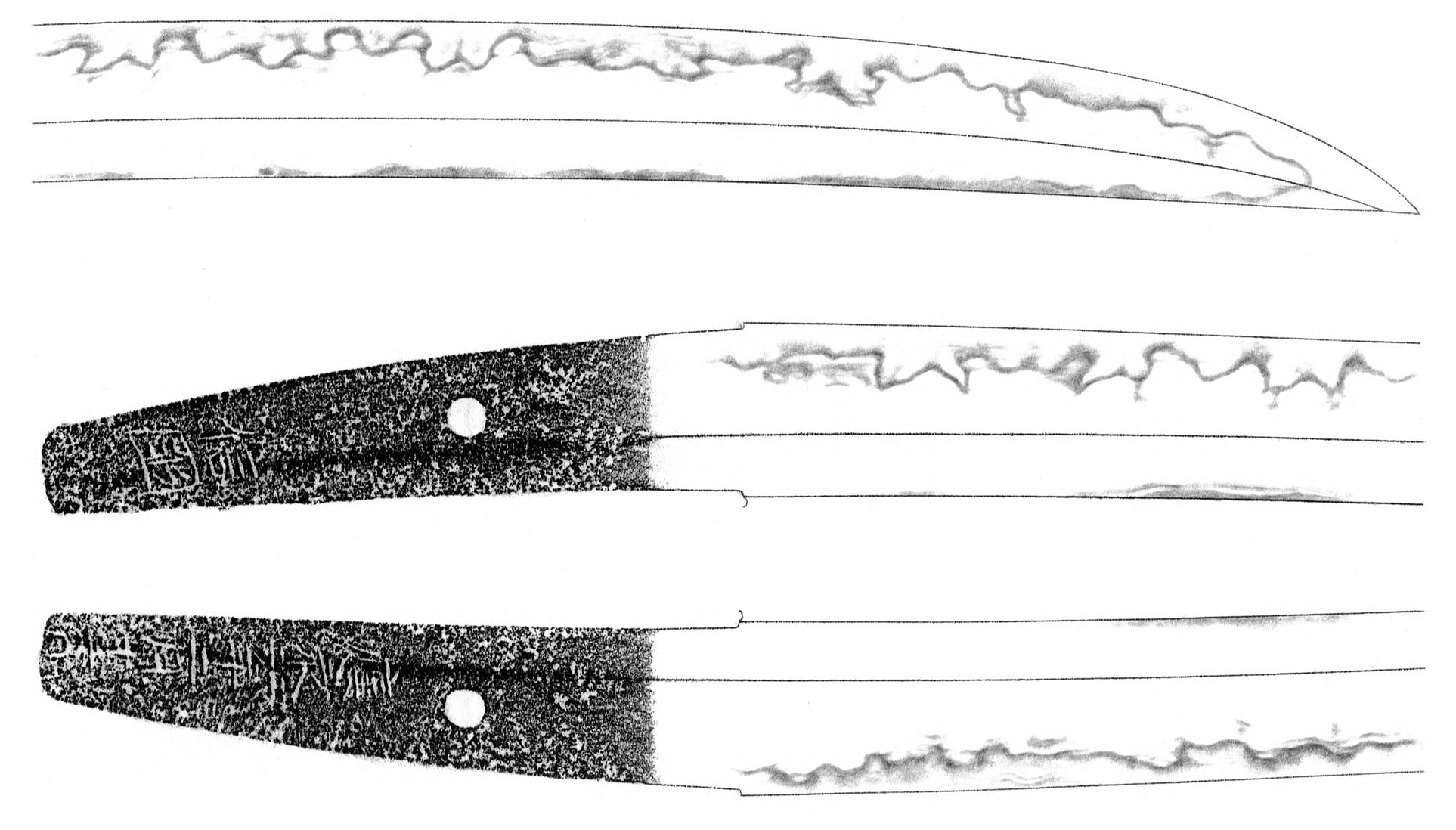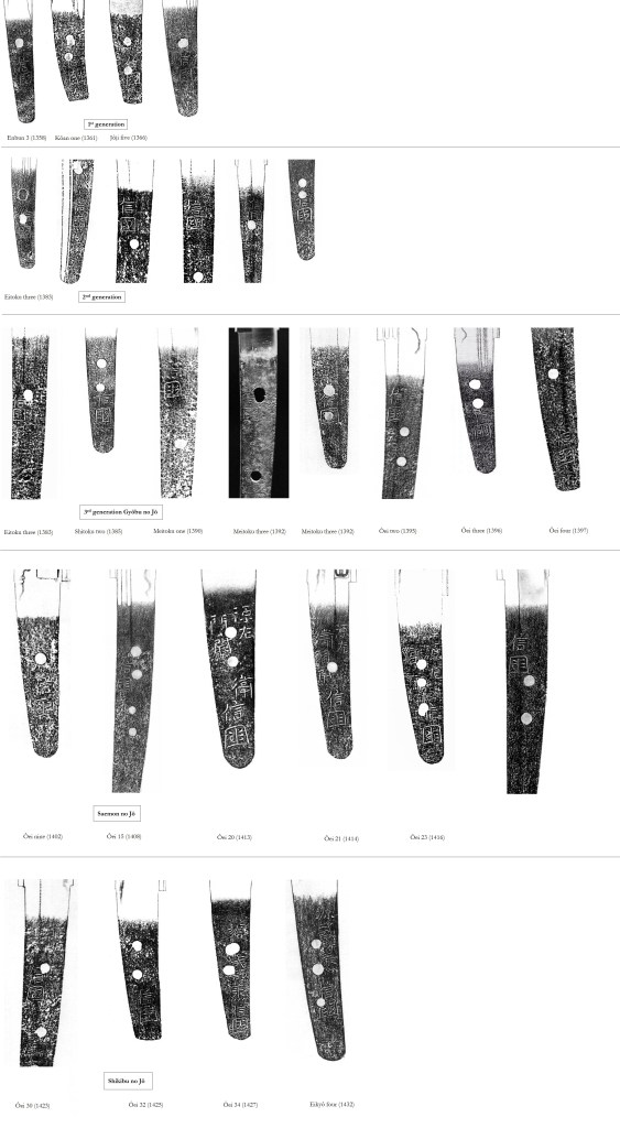 This time we continue with the Nobukuni smiths who were active around Ôei (応永, 1394-1428) and of which we can at least make out two individual names, Minamoto Saemon no Jô (源左衛門尉) and Minamoto Shikibu no Jô (源式部尉) Nobukuni. As mentioned in the previous chapter, everything points towards that these two were brothers and sons of the 2nd generation Nobukuni. Following Tsuneishi’s approach, there was a third son, Gyôbu no Jô (刑部尉), who seems to have been the first born son but who, according to Tsuneishi, only signed with “Nobukuni” and not with any honorary title or first name. This approach is insofar supported by the fact that there are no blades known which bear the title Gyôbu no Jô in the mei but several from that time, i.e. Ôei, whose niji-mei “Nobukuni” differs from that of Saemon and of Shikibu no Jô. Thus this Gyôbu no Jô might have been the official successor of the lineage, signed like his predecessors just in niji-mei, but was supported by his two brothers in keeping the Nobukuni workshop going. Incidentally, Saemon no Jô Nobukuni is also referred to as Genzaemon no Jô Nobukuni because the clan name Minamoto can also be read as Gen and “results” with the subsequent Saemon in another first name, Genzaemon. In other words, his mei of clan name plus first name was interpreted wrongly in some older sources, that is as a single first name, but this Genzaemon reading has become so widespread that it is also used as kind of a nickname for Minamoto Saemon no Jô Nobukuni.