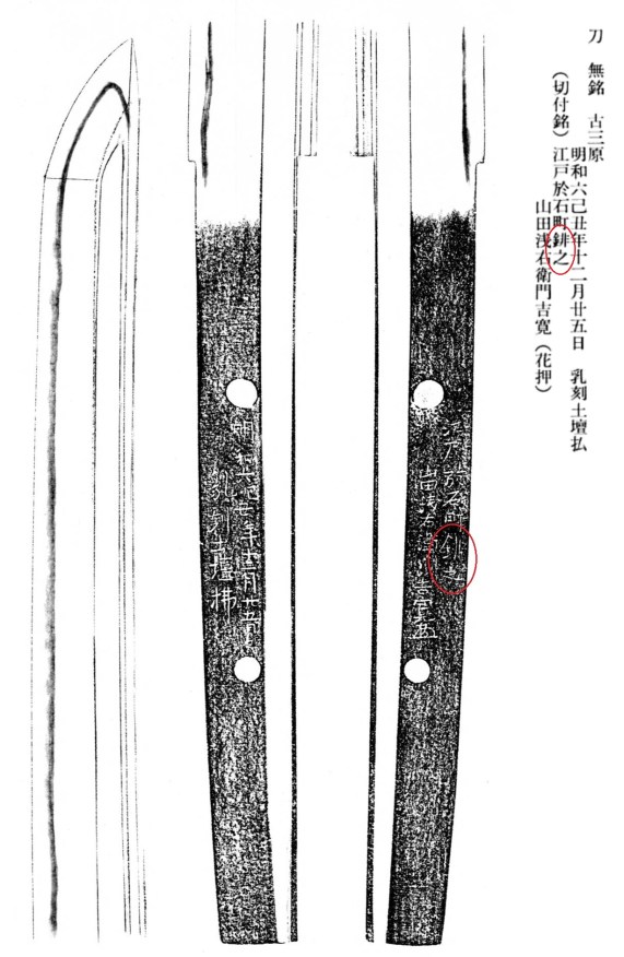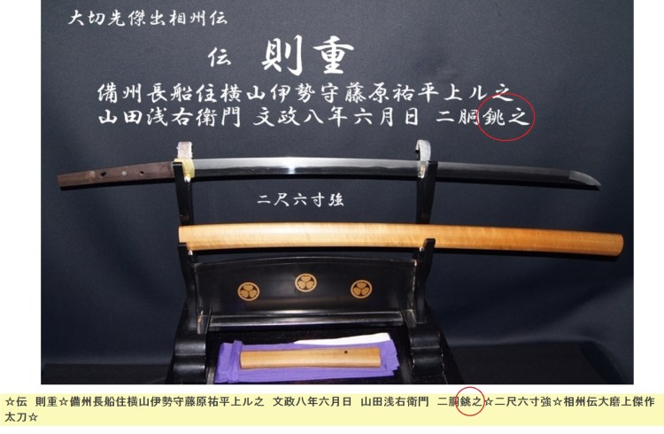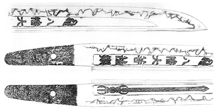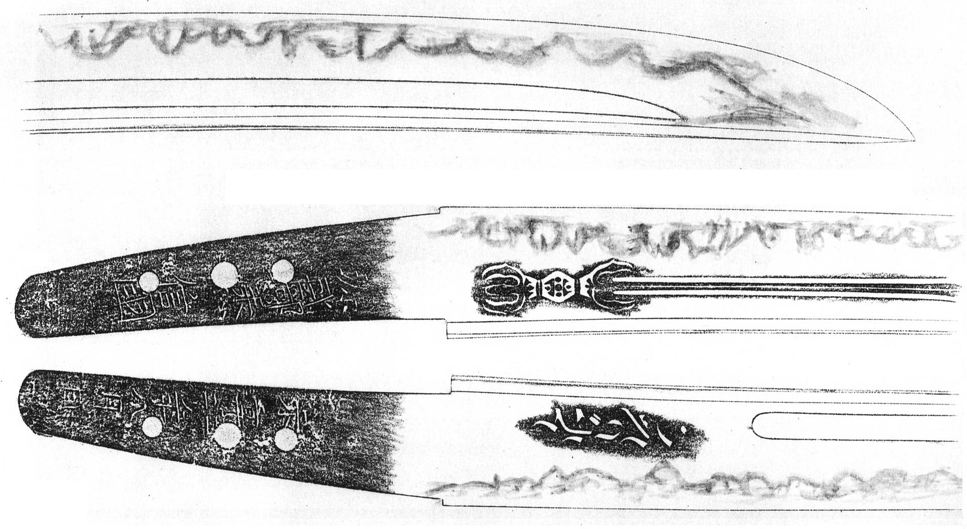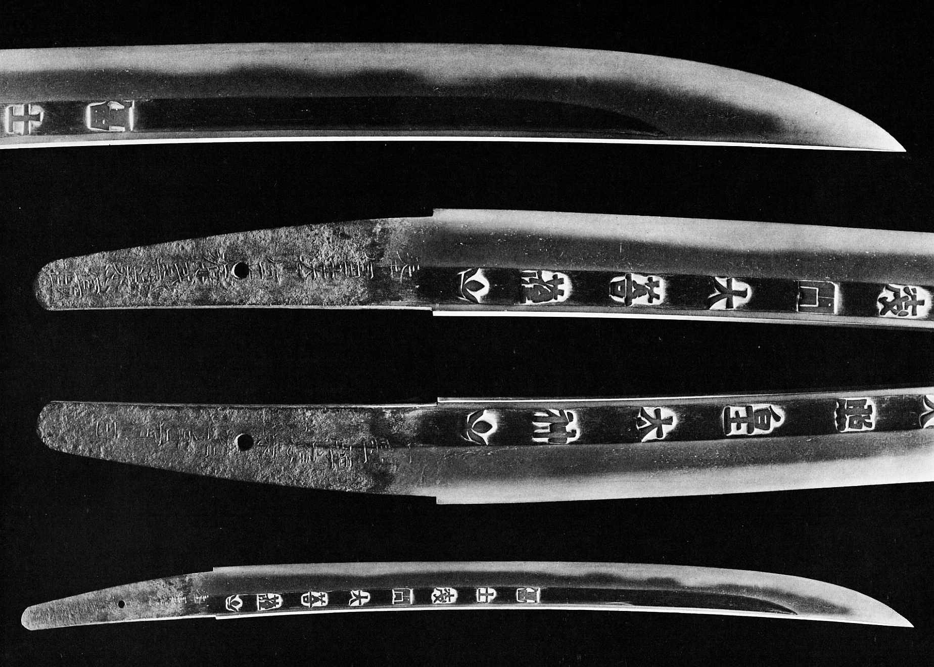 This time we continue with the Nobukuni smiths who were active around Ôei (応永, 1394-1428) and of which we can at least make out two individual names, Minamoto Saemon no Jô (源左衛門尉) and Minamoto Shikibu no Jô (源式部尉) Nobukuni. As mentioned in the previous chapter, everything points towards that these two were brothers and sons of the 2nd generation Nobukuni. Following Tsuneishi’s approach, there was a third son, Gyôbu no Jô (刑部尉), who seems to have been the first born son but who, according to Tsuneishi, only signed with “Nobukuni” and not with any honorary title or first name. This approach is insofar supported by the fact that there are no blades known which bear the title Gyôbu no Jô in the mei but several from that time, i.e. Ôei, whose niji-mei “Nobukuni” differs from that of Saemon and of Shikibu no Jô. Thus this Gyôbu no Jô might have been the official successor of the lineage, signed like his predecessors just in niji-mei, but was supported by his two brothers in keeping the Nobukuni workshop going. Incidentally, Saemon no Jô Nobukuni is also referred to as Genzaemon no Jô Nobukuni because the clan name Minamoto can also be read as Gen and “results” with the subsequent Saemon in another first name, Genzaemon. In other words, his mei of clan name plus first name was interpreted wrongly in some older sources, that is as a single first name, but this Genzaemon reading has become so widespread that it is also used as kind of a nickname for Minamoto Saemon no Jô Nobukuni.