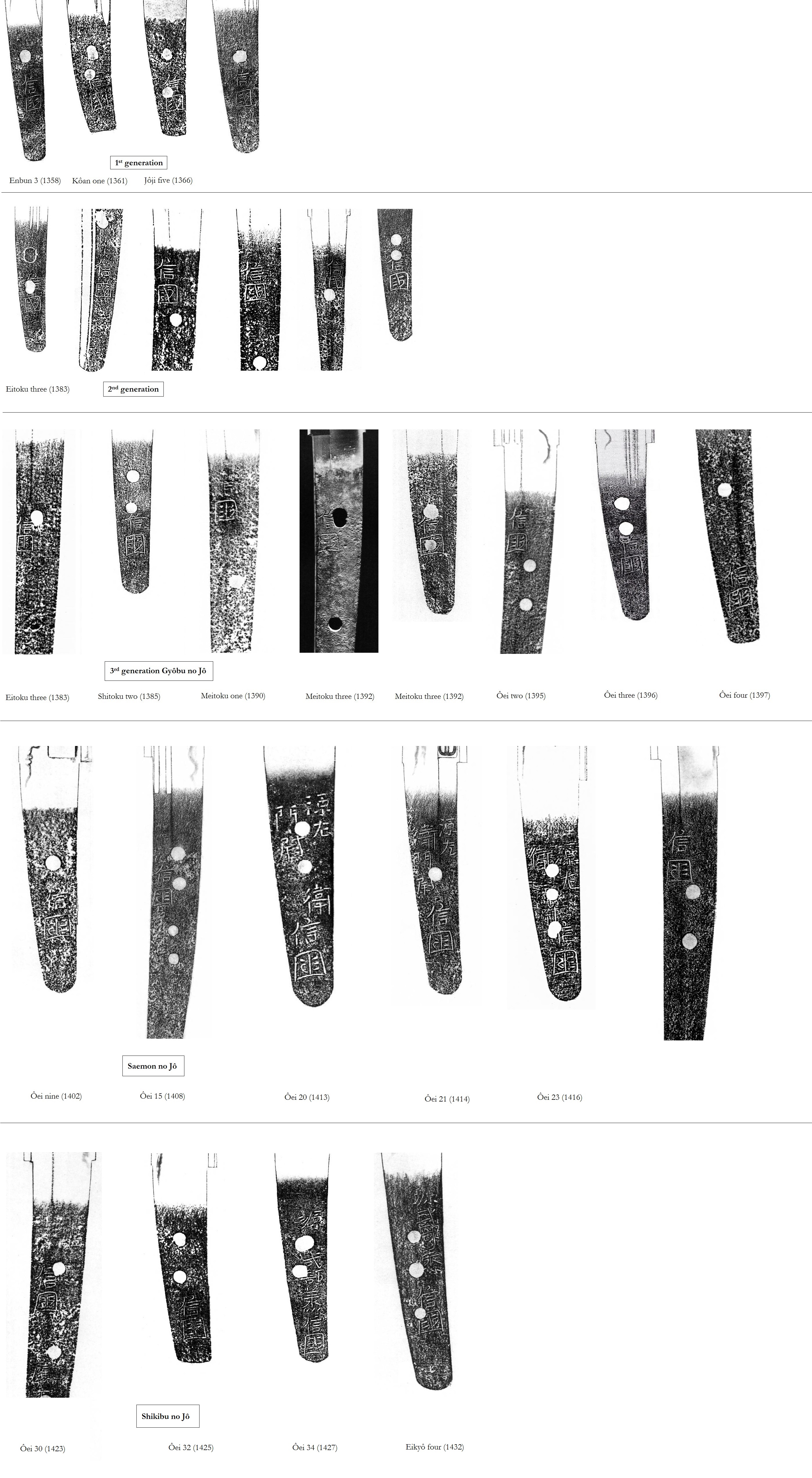 This brings us to the difficult case of trying to find out which Ôei-Nobukuni works go back to the hand of Gyôbu no Jô Nobukuni. To do so, I first want to introduce in picture 24 the different Nobukuni signature styles (click to see full-size pic). As you can see, the 1st generation signed the character for Nobu somewhat “squeezed” to left. Apart from that, his character for kuni is a little bit distorted, i.e. tilting a little bit to the top right. The 2nd generation did not squeeze the character for Nobu so much to the left, only a tiny little bit, and the one shown on the far right of my chart might be an edge case in term of signature style, although the work, which was introduced in picture 13 in the previous chapter, is attributed to the 2nd generation. Also he signed the left three internal strokes of the character for kuni in a more horizontal way than the 1st generation did. Saemon no Jô Nobukuni signed in a peculiar way, namely with the left and right inner parts of the character for kuni mirrored and with the central “dividing” stroke executed in a vertical manner. So his signatures are pretty easy to detect. Shikibu no Jô signed the left and right inner parts in the usual way and executed the central “dividing” stroke in a slightly diagonal manner but his works can be distinguished from the others in terms of slightly more advanced production time. So then there are signatures which significantly predate works of Shikibu no Jô and which do not match the mirrored signature of Saemon no Jô. These signatures, of which we know dates from Eitoku three (1382) to Ôei four (1397), are executed with the central “dividing” stroke in a very vertical manner and as they thus differ from works of the 2nd generation, of works of Saemon no Jô, and of works of Shikibu no Jô, both in terms of meiburi and production time, I attribute those for the time being to the 3rd generation, to Gyôbu no Jô Nobukuni.