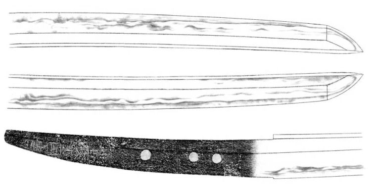 Picture 2 shows the tachi with the questionable mei/date. It has relatively unobtrusive sugata, i.e. not heyday Nanbokuchô, what would corroborate its date, and ends in an elongated chûj-kissaki. Don’t be mislead by the four mekugi-ana and the low signature, the blade is considered to be ubu. That is, we have here already one of the typical characteristics of the Hasebe School, namely signing the blades sometimes at the very bottom of the tang. As you can see in the oshigata, the hamon is a rather calm suguha with some midare towards the base and the kaeri of the bôshi encloses a shimaba, a feature that is often seen at Sôshû blades, e.g. at Masamune.