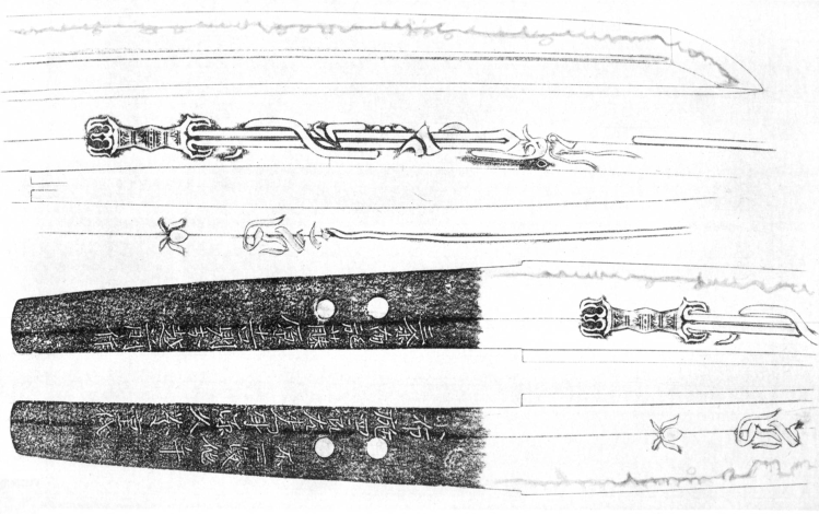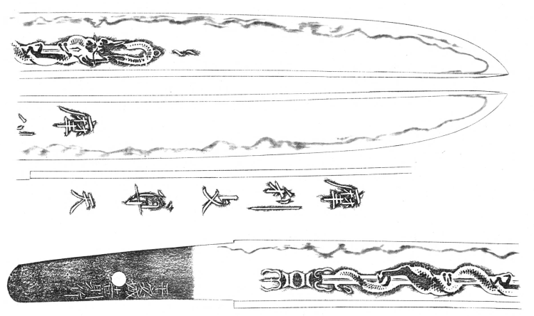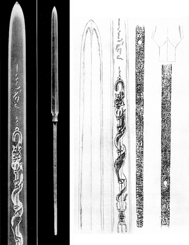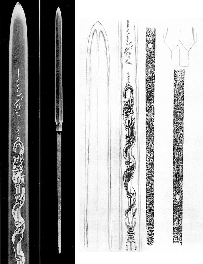 Although not as obvious as seen at the Heianjō Nagayoshi lineage, the Yoshinori lineage did focus on horimono too. The last blade that I want to introduce in this chapter is such an example (see picture 11). It is a hira-zukuri ko-wakizashi with a wide mihaba and some sori that shows a dense itame that is tends to nagare-masame towards the ha and the mune and that features ji-nie and chikei. The hamon is a ko-nie-laden ko-notare with a wide and clear nioiguchi that is mixed with gunome, yubashiri, and sunagashi. The bōshi is notare to midare-komi and has a ko-maru-kaeri. On the omote side we see again a kurikara and on the ura side the name of the deity Marishi-Sonten (摩利支尊天).