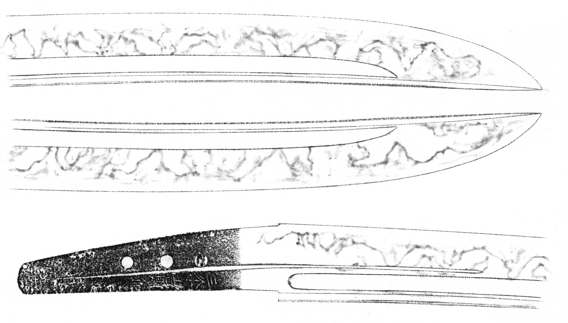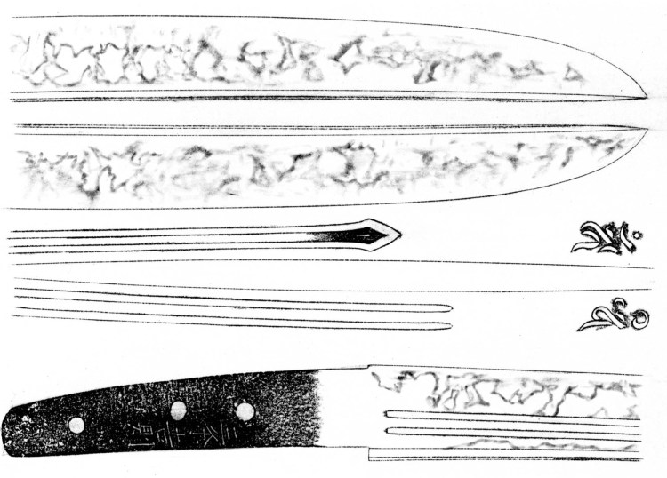 Katana are mostly short and show an elegant toriizori but which often tends to sakizori and with their slender mihaba, these blades look like elongated kodachi and are overall of a weak/delicate sugata. The hardening is usually in nie-deki but we also see chū-suguha with hardly any nie at all, a Bizen-style koshi no hiraita-midare, or a Mino-style gunome-midare, and some blades show some mura-nie. The jihada is a mokume mixed with masame and is generally weak with a tendency to roughness. The steel is blackish but may also show shirake. The bōshi is either ichimai or ko-maru whereas the kaeri often runs back in a Yamashiro-atypical long manner. This trend to slender blades with a nioi-based suguha is particularly seen at later works. These blades usually show a frayed nioiguchi that lacks power and brightness. Wakizashi and tantō may show a vivid yahazu-midare or ō-midare with mura-nie but again, the interpretations overall lack power. Horimono may be present but they are more rare than at the Heianjō Nagayoshi lineage. Some works are very similar (also in terms of overall quality) to the Bizen Yoshii Yoshinori lineage of the same name. However, the sugata is different as the Yoshii Yoshinori works show a koshizori and the Sanjō Yoshinori works a toriizori with a tendency towards sakizori. Although nie of Sanjō Yoshinori works of that time lack nie, they are still there, and more prominent, than at the nioi-deki of Yoshii Yoshinori works. Also the jigane differs. Apart from that, works from both groups are usually signed with a reference to the production site, i.e. “Yoshii-jū Yoshinori” in case of the Bizen smiths and “Sanjō-jū” or “Heianjō-jū Yoshinori” in case of the Kyōto smiths. That is, only the early masters signed in niji-mei.
