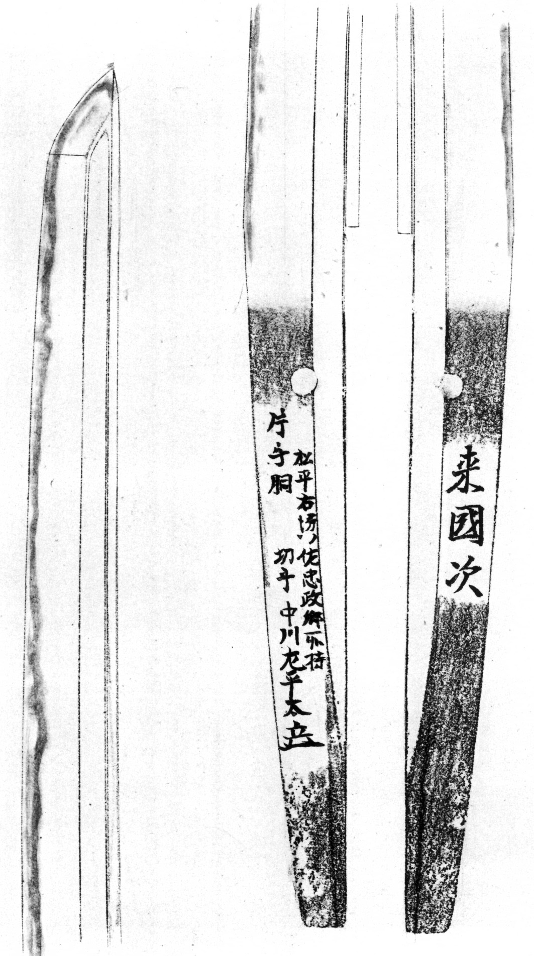Now Rai Kunitsugu is known as a Rai smith who incorporated more than his school colleagues the Sōshū tradition and so a blade like here with such a dense ko-itame and a calm suguha-chō is atypical for him. This was also recognized by the NBTHK when the blade passed jūyō in 1975 and the kinzōgan-mei attribution (not the cutting test and the information on the owner) was put in the certificate with reservation, i.e. as to kinzōgan-mei ga aru (と金象嵌銘がある). The state of the blade as it passed jūyō is shown below.