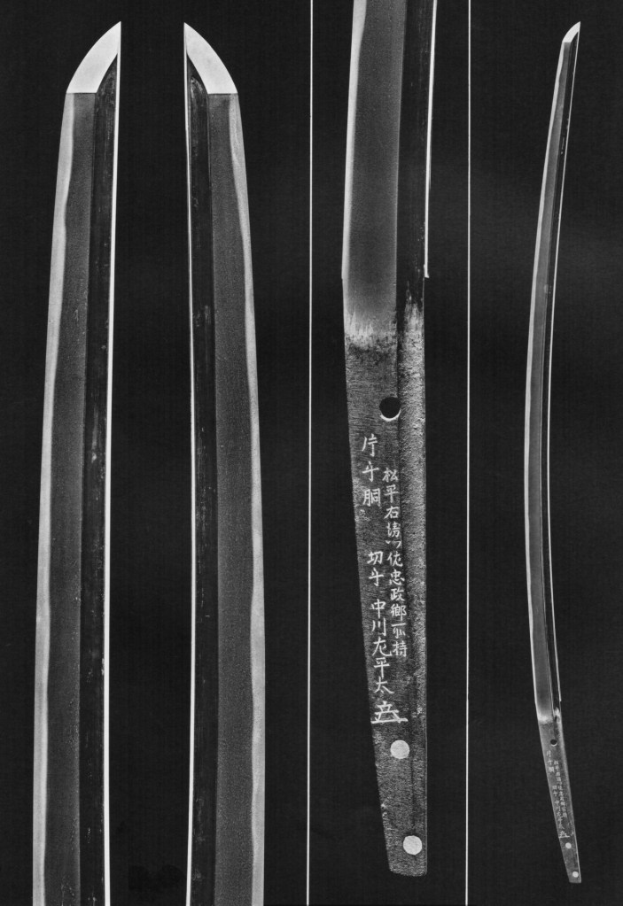 Picture 1: jūyō in 1975, nagasa 71.5 cm, sori 2.2 cm, motohaba 2.7 cm, sakihaba 1.7 cm, moto-kasane 0.6 cm, kissaki-nagasa 2.3 cm, nakago-nagasa 19.2 cm