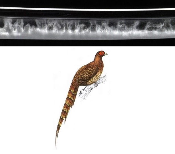 In short, Sanshōmō became Sanchōmō and the latter then also became Yamatorige, with no one being able today to say with certainty what the actual origins of that nickname are. To me personally, the hamon of the blade sure looks more like fire but with some imagination, I can also see the resemblance to the staggered, graded tail feathers of a copper pheasant (see picture below). Also, as you may have noticed in the above quote, the blade was once attributed to Osafune Kanemitsu and handed down within the Uesugi family as such. When Emperor Meiji visited the Uesugi on their lands in Yamagata in Meiji 14 (1881), he was shown the Sanchōmō/Yamatorige as he was known to be a great sword lover, which was then still labeled as Kanemitsu.
