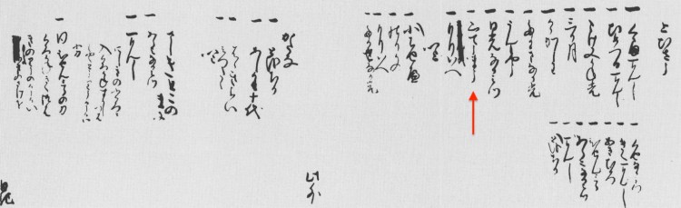 So, already the Uesugi records are aware of the ambiguity of the blade’s nickname and some even interpret it as “mountain that appears to be on fire due to the evening sun” or as “resembling the controlled burning of dead grass on a hillslope (yamayaki/sanshō) in spring (in order to stimulate growth).” However, that ambiguity goes to a certain extent back to how Kenshin’s son Uesugi Kagekatsu (上杉景勝, 1556-1623) recorded the blade when he made his famous list of the 35 greatest treasure swords in his possession (he had inherited the blade afer his father’s death). That is, Kagekatsu used the archaic way (山てうまう) (see picture below) to note the term Sanchōmō, i.e. teu (てう) being an archaic hiragana variant of chō(ちょう) and mau(まう) of mō(もう). So without kanji characters, the exact meaning is unclear.