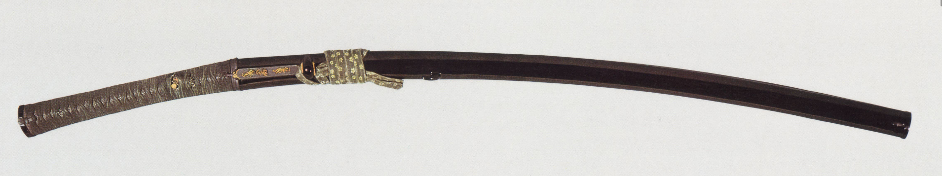 “When Uesugi Kenshin (上杉謙信, 1530-1578) (then named Nagao Kagetora, 長尾景虎), set out in the tenth month of Kōji two (弘治, 1556) to Kōzuke province where the local castellan of Shiroi Castle (白井城) and relative of Kenshin, Nagao Norikage (長尾憲景, 1511-1583), presented him with a sword by Kanemitsu (兼光). The sword was nicknamed Sanshōmō/Sanchōmō, either because its hardening pattern resembles a forest fire (shō, 焼) on a distant mountain (san, 山), or because it resembles the beautiful tail feathers (mō/ge, 毛) of a copper pheasant (yamadori/yamatori/sanchō, 山鳥).”