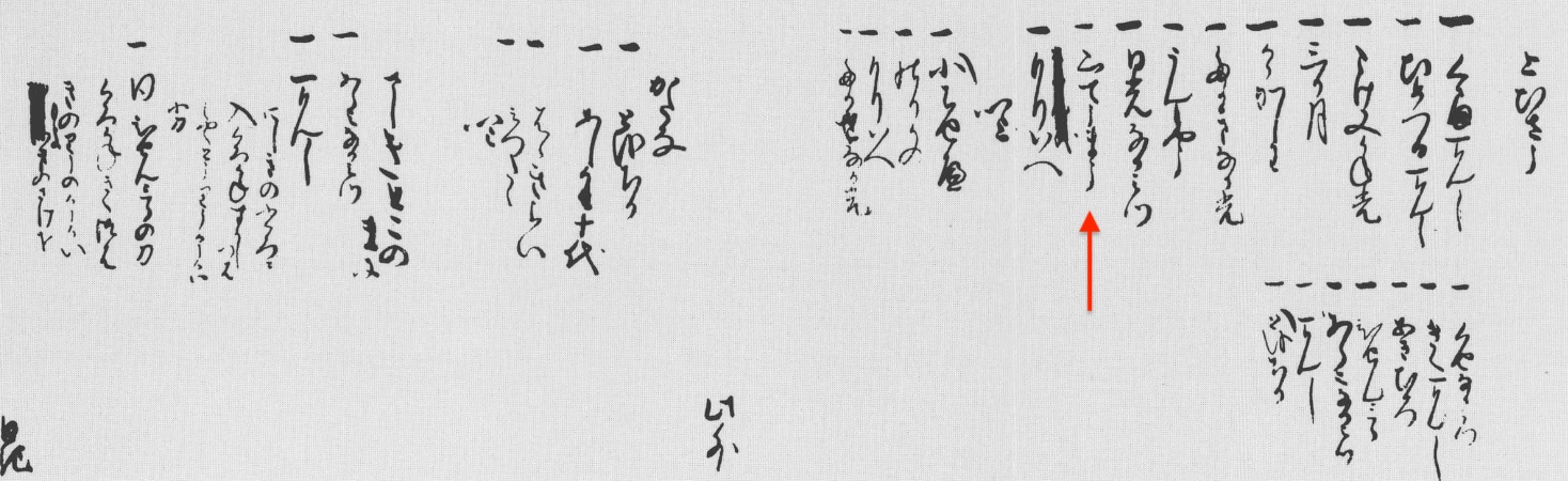 So, already the Uesugi records are aware of the ambiguity of the blade’s nickname and some even interpret it as “mountain that appears to be on fire due to the evening sun” or as “resembling the controlled burning of dead grass on a hillslope (yamayaki/sanshō) in spring (in order to stimulate growth).” However, that ambiguity goes to a certain extent back to how Kenshin’s son Uesugi Kagekatsu (上杉景勝, 1556-1623) recorded the blade when he made his famous list of the 35 greatest treasure swords in his possession (he had inherited the blade afer his father’s death). That is, Kagekatsu used the archaic way (山てうまう) (see picture below) to note the term Sanchōmō, i.e. teu (てう) being an archaic hiragana variant of chō(ちょう) and mau(まう) of mō(もう). So without kanji characters, the exact meaning is unclear.
