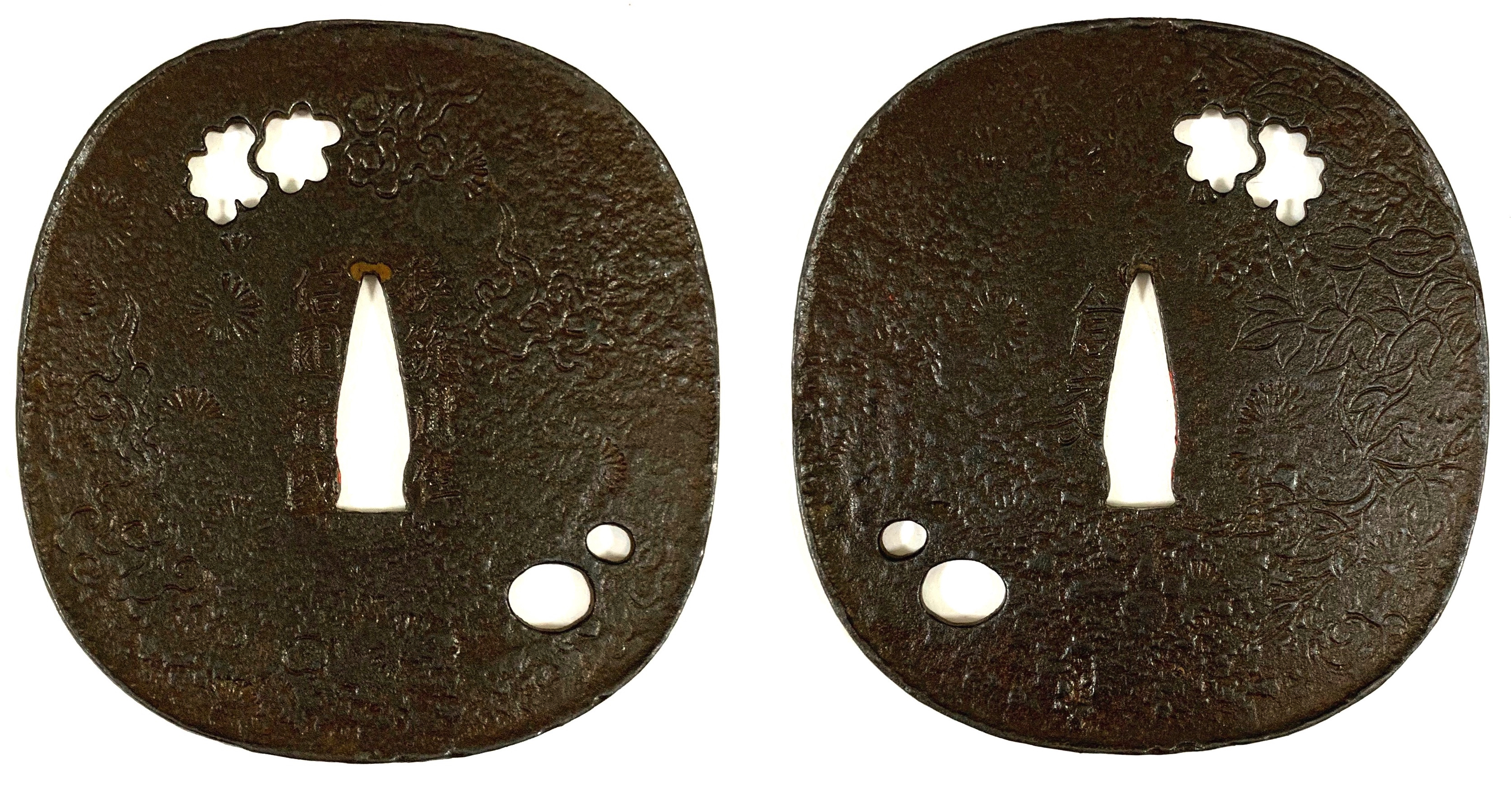 As the more experienced realize right away, and as obviously stated in the mei, we have here a late Edo period Nobuie copy. Such copies and homages were very popular at that time and were produced by many renowned tsuba makers, swordsmiths, and armorers alike. For example, by master Naotane’s son-in-law Jirō Tarō Naokatsu (次郎太郎直勝, 1805-1858) and by numerous craftsmen from the Myōchin School.