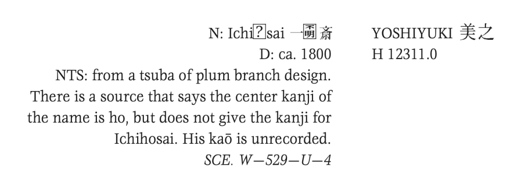 After Katsuaki’s death, the atelier was run by his first son Katsunao (克直), real name Hasegawa Kikujirō (長谷川菊次郎), and his second son Ichibōsai Shunkō (一望斎春江), real name Hasegawa Takesaburō (長谷川竹三郎, 1878-1944). The former died young, however, and the latter then focused more on metal work for the tea ceremony and jewelry than on tsuba, starting so a new lineage under the brand name Ichibōsai (一望斎). The second generation Ichibōsai was Shunkō’s son Shunsen (春泉) who was succeeded by his second son Shunkō (春洸), real name Hasegawa Takejirō (長谷川竹次郎, 1950- ), as third generation Ichibōsai. With this, I would like to conclude by saying that Takejirō and his wife Mami (まみ, 1946- ), who had studied with her father-in-law Shunsen, are both renowned metal artists and are still based in Nagoya.