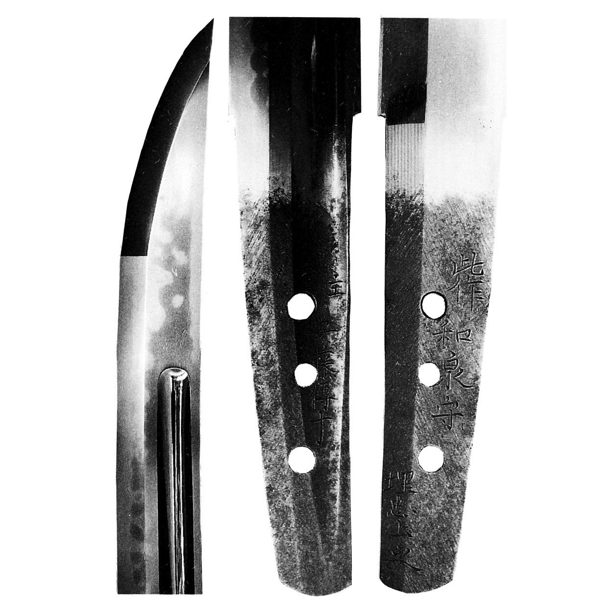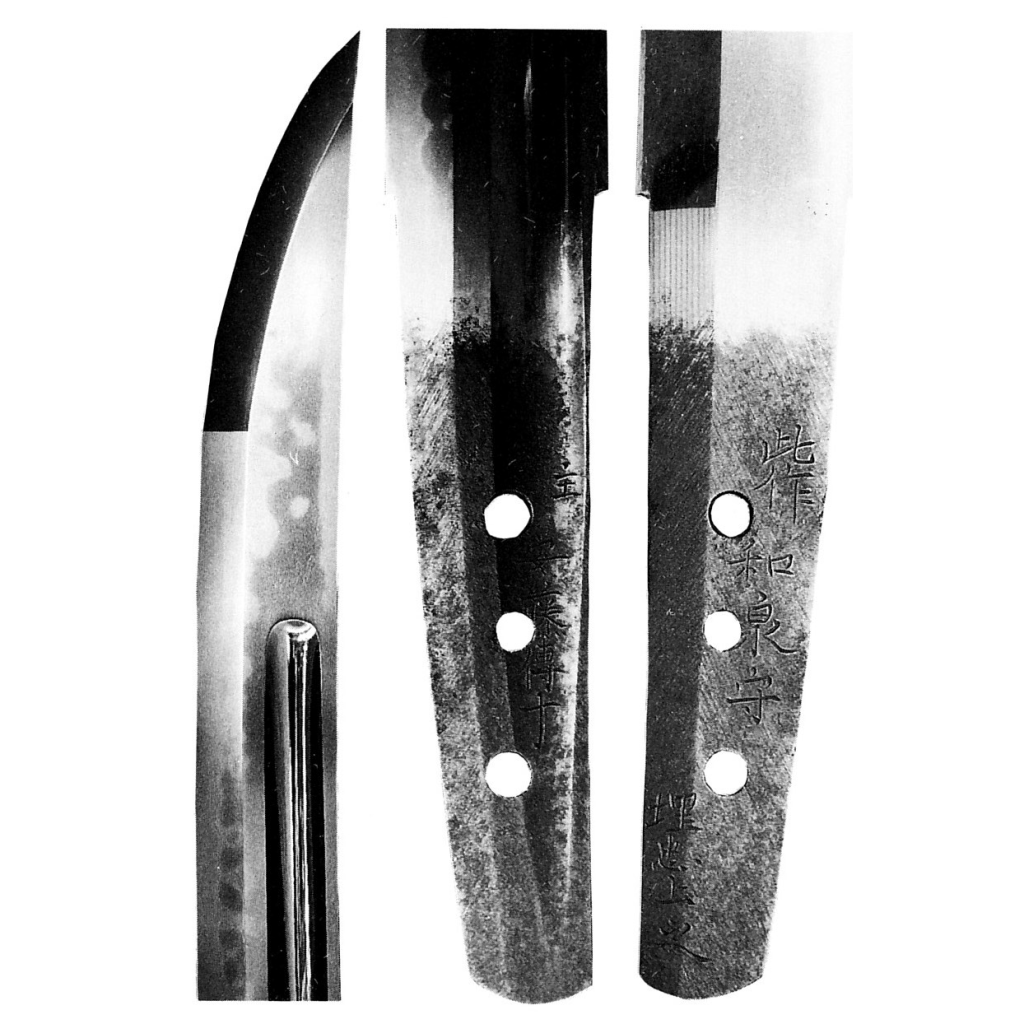 Picture 1: Wakizashi, kiritsuke-mei: Shu Andō Denjū – Kono saku Izumi no Kami, Umetada kore o ageru (主安藤伝十・此作和泉守 埋忠上之) – “Owner Andō Denjū, work of Izumi no Kami, shortened by the Umetada.” Nagasa 52.9 cm, sori 1.2 cm, kasane 0.45 cm, katakiriba-zukuri, mitsu-mune.