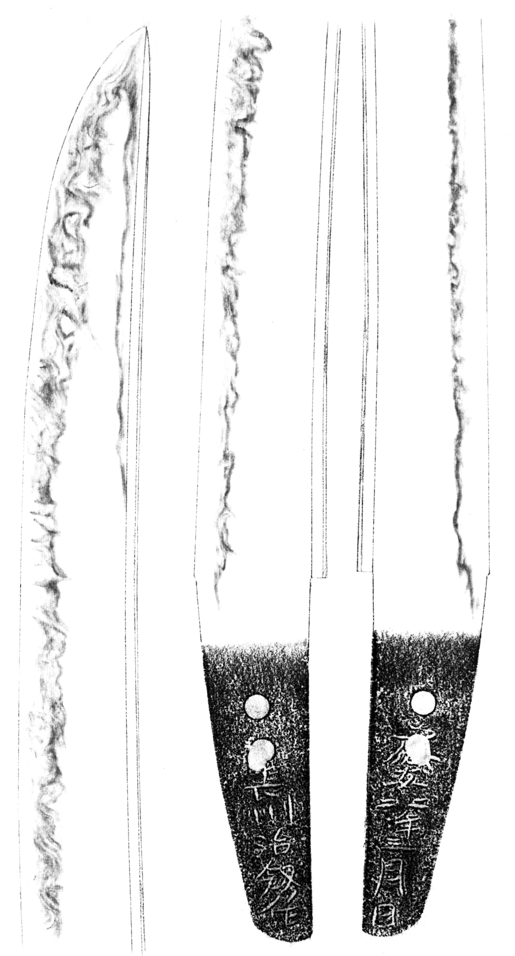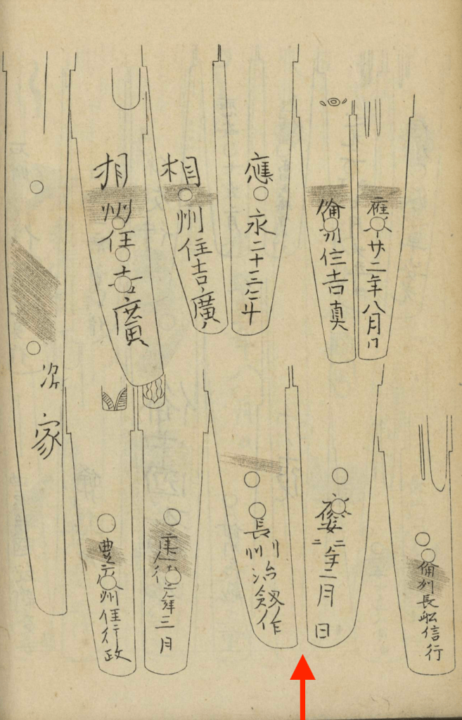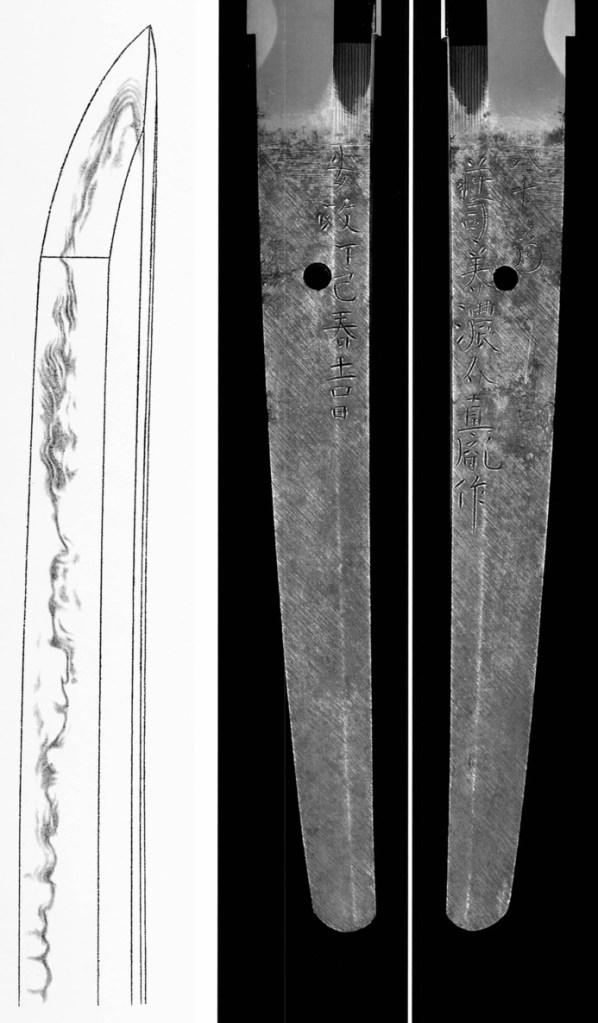 Well, this Jūyō blade was the only work by Haruakira that I was able to find in my references. Interestingly, it is featured in the Kōzan Oshigata (光山押形), which was compiled in the late 17th to early 18th century. Since the time that source was compiled, the second mekugi-ana had been enlarged. Please note that although the signature is fairly faithfully copied, the Kōzan Oshigata got the date wrong. That is, one stroke for the month was overlooked by Hon’ami Kōzan (本阿弥光山, 1634–1714) and therefore the second (二月) instead of the third month (三月) was written into the oshigata. Compared to the rest of the signature, which is fairly faithfully copied as mentioned, the entire part of the month and day is noticeably off. Maybe Kōzan did not pay much attention to the lesser important parts of the date here?