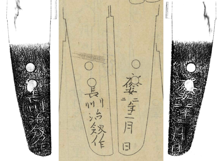 I would like to conclude by reflecting on the local historical context. With the exception of the influx of Sa School smiths around the mid-Nanbokuchō period and of Niō (二王) School smiths migrating from neighboring Suō province throughout the 15th century, Nagato province never had been a notable production center for swords. It is interesting to observe that the meikan do not list any Nagato smiths before the Nanbokuchō period. This is insofar odd as the Kamakura Shōgunate installed a local commissioner in Nagato (Nagato Tandai, 長門探題) in 1276 to oversee coastal defense after the Mongols had invaded two years prior. Seems as if this did not have any impact on local sword production, meaning that the troops employed there were likely sourcing their swords from other provinces (or merely brought them with them).