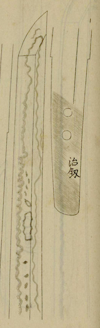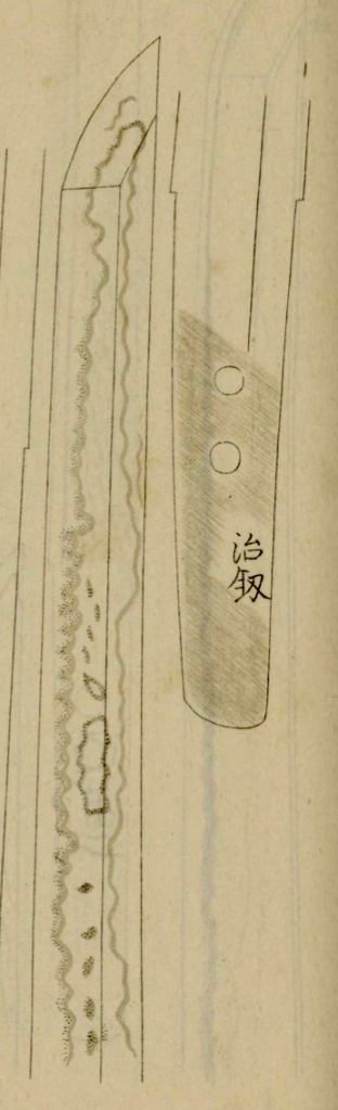 I was not able to find works by any of the later two Haruakira either, but one blade of the Eishō-era smith is featured in the Tsuchiya Oshigata (土屋押形), which was compiled from existing oshigata taken by Tsuchiya Harunao (土屋温直, 1782–1851). The blade appears to be a katateuchi-style uchigatana, which became increasingly popular around the time that Haruakira was active, and features tobiyaki and very prominent muneyaki. The yobiyaki, however, look a bit “disorganized,” and if you zoom in on the habuchi, it looks like that the ha is nie-laden. Interestingly, this Haruakira used the character (釼) instead of (剱) for the character akira (the difference is in the left-hand radical).