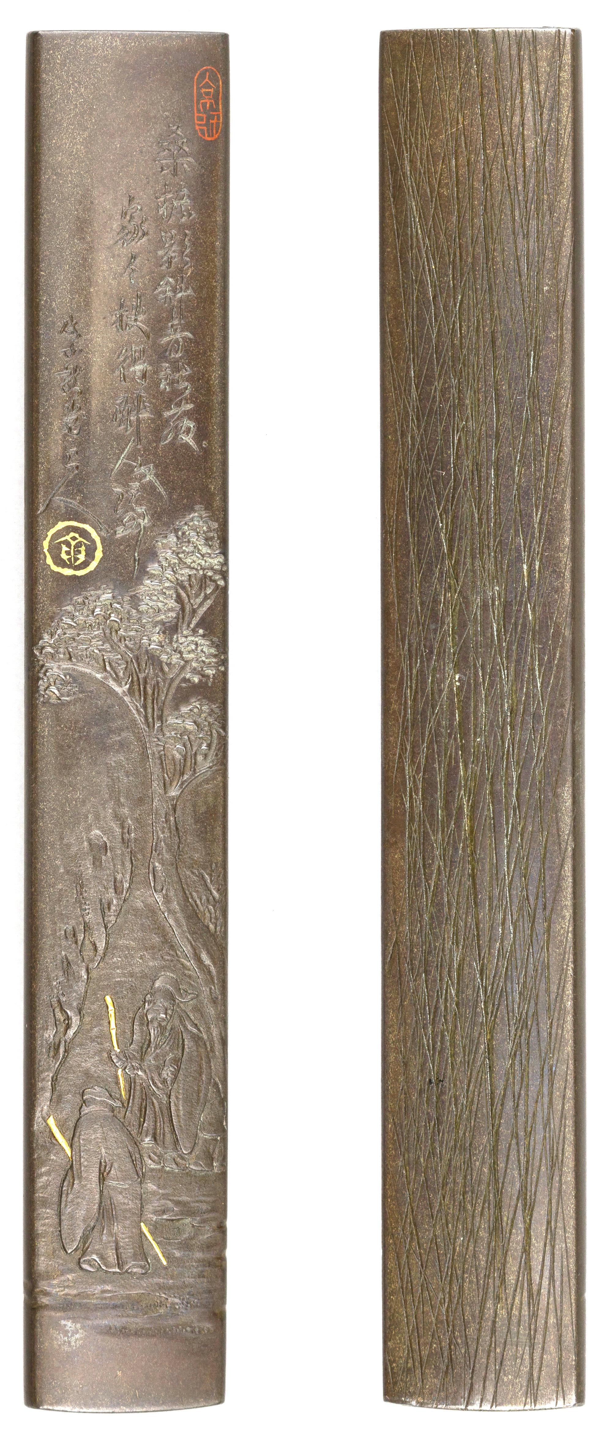So, the object in question, which has the accession number 43.120.151, is a humble kozuka that bears an inscription and a difficult to decipher signature. The piece itself is of shibuichi and depicts a tree and two eldery men in low relief, whose walking sticks are highlighted via gold iroe. Thus, my first thought was, the motif is probably a reference to some famous Chinese subject, like Taoist immortals or hermits, etc. In any case, I was more interested in the inscription as I always see them as a challenge and good opportunity to learn something.
