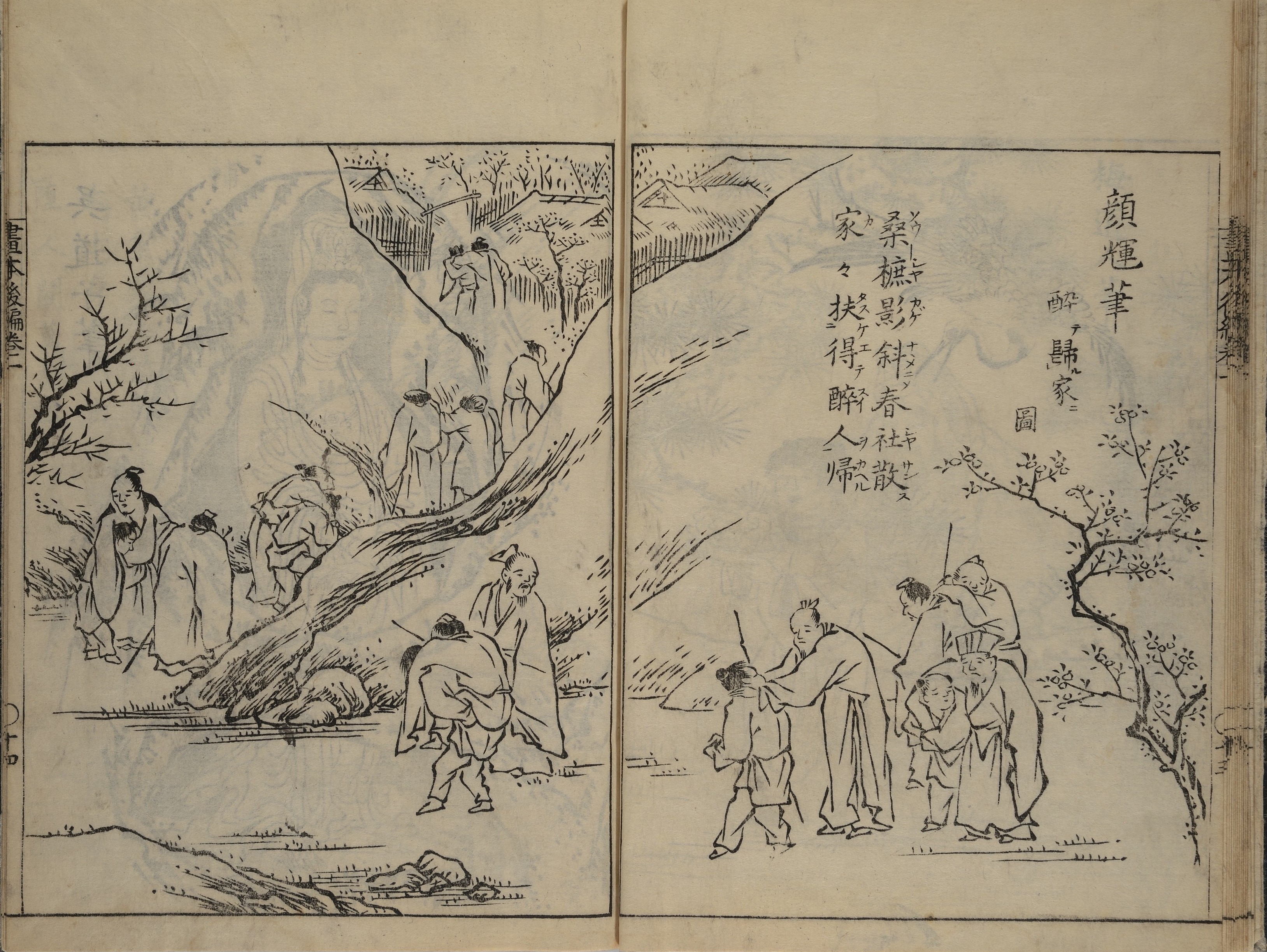 The aforementioned double-page is titled: Gan Ki hitsu (顔輝筆, “Painting by Yán Huī [early 14th century]”) and Yotte Kika Zu (酔歸家圖, “Drunks Going Home”). This title is then followed by the very poem we see on the kozuka, and the double-page can be seen below.