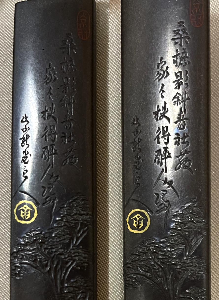 But, it wouldn’t be fun without a little mystery, right? The mystery in this case being the actual signature of the piece. For the sake of completeness, the copper seal at the very top right of the kozuka reads “Kyōto seal” (京印). Now, the mei (some shots that show the mei and inscription a little better are shown below) starts with Shiryū (紫龍), which is one of the many art names (gō) of Ōtsuki Mitsuoki (大月光興, 1766–1834), and the last two characters are dōjin (道人). The character in between is a bit difficult to read, but I think it is Mitsu (光). That is, it does not appear as dō (堂) to me, which Mitsuoki used as suffix for the previously mentioned art name in the form of Shiryūdō (紫龍堂), and it does not appear to be Kyoku (髷) either, which Mitsuoki used as a prefix for dōjin to create yet another art name, Kyoku-dōjin (髷道人). In short, the signature could either be “Shiryūdō-dōjin” (紫龍堂道人), or “Shiryū Kyoku-dōjin” (紫龍髷道人), but as mentioned, I don’t think that this is the case. We know that Mitsuoki very often abbreviated his family name Ōtsuki (大月) to just as Tsuki (月). So, there is the remote possibility that he abbreviated his name Mitsuoki to just as Mitsu here, although I have to admit, I have never seen any other work of his signed this way, i.e., “Shiryū Mitsu dōjin” (紫龍光道人)…