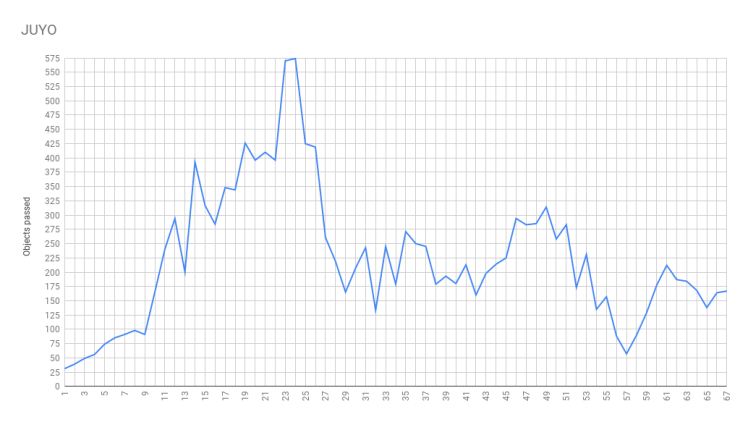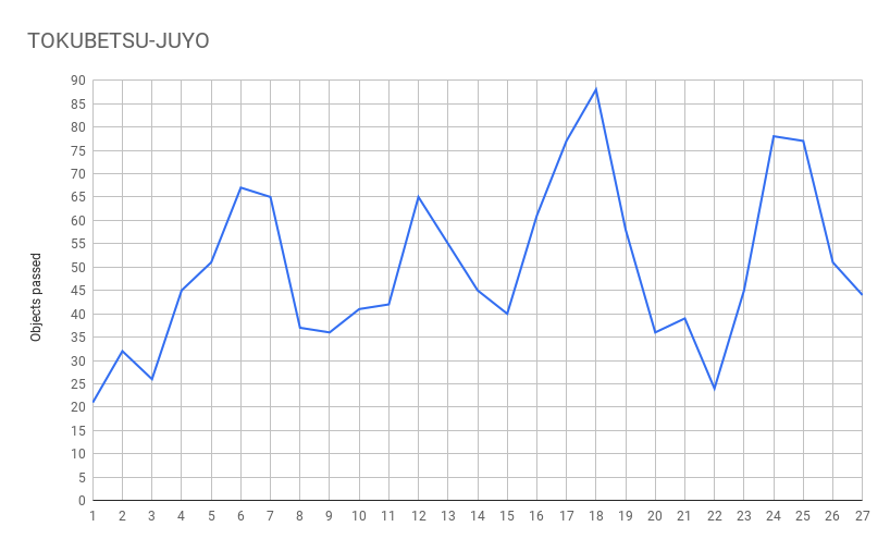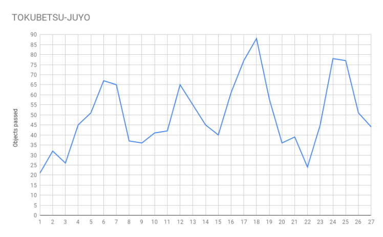 As for the years, the current Jūyō system started in 1958, and the first Tokubetsu-Jūyō Shinsa was held in 1971, just so that you get a better idea of the x axis of the two charts below.